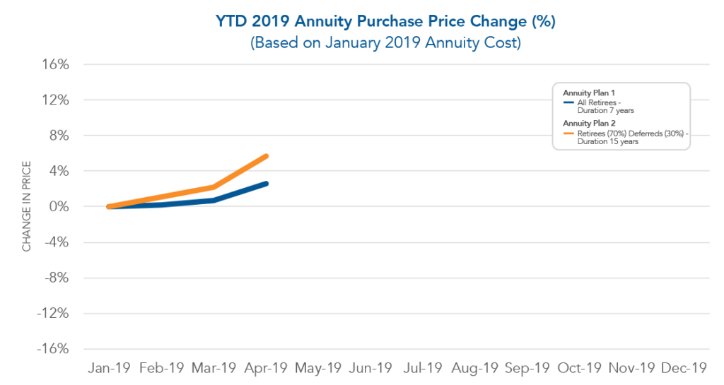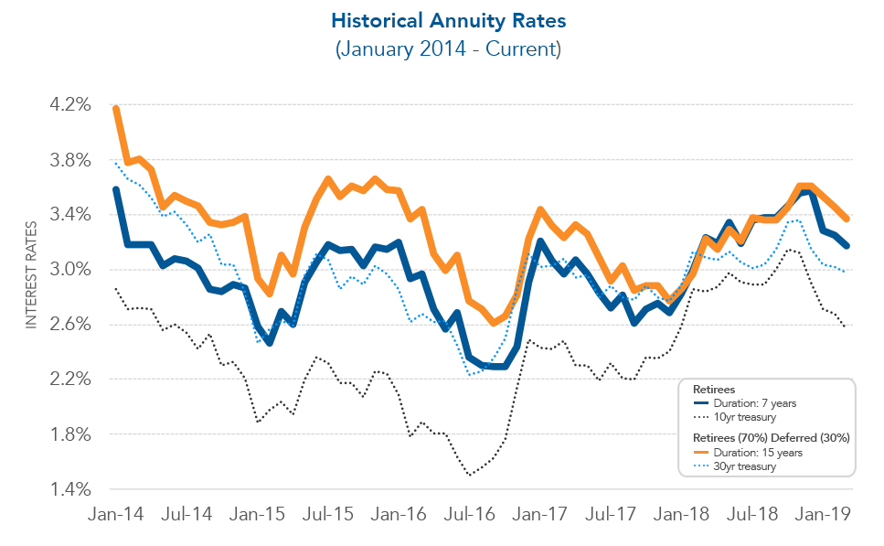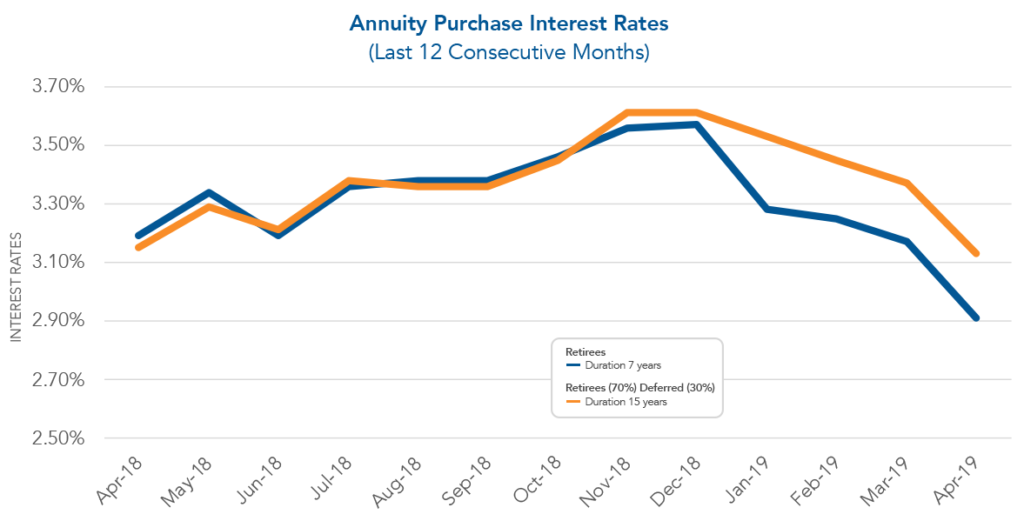 The first quarter of 2019 shows a noticeable drop in annuity purchase interest rates. However, our experiences during the first quarter have shown that insurers are pricing annuity purchases aggressively. Annuity purchase prices have not risen as much as expected based on the drop in interest rates, yet we do not know how long this favorable aggressive pricing from insurers will last.