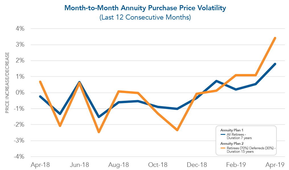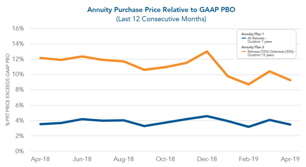 During 2018, the spread of annuity purchase prices above the GAAP projected benefit obligation (PBO) remained fairly stable, at around 4% for Annuity Plan 1 and 12% for Annuity Plan 2. From December 2018 to April 2019, as annuity purchase interest rates and yield curve interest rates changed rapidly, the spread narrowed for both plans. Narrowing of the spread may represent an opportunity to complete an annuity purchase at a relatively cheaper price than when the spread is larger. Note that the below PBO calculations exclude future overhead costs that plan sponsors would pay to retain participants in the plan– examples of these overhead costs are administrative expenses and PBGC premiums. Future overhead costs would narrow the spread, though the extent to which the overhead costs narrow the spread is plan specific.