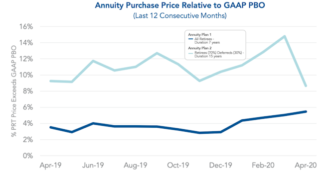 In April 2020, the spread for Annuity Plan 2 dropped to nearly 8.5% and although the spread for Annuity Plan 1 increased, it remained fairly stable. Relative to GAAP, we have seen that an increase in annuity purchase rates generally lowers annuity purchase prices. Keep in mind that the below PBO calculations exclude future overhead costs paid by plan sponsors to retain participants in the plan. Administrative expenses and PBGC premiums are examples of these overhead costs. Future overhead costs would narrow the spread, though the extent is plan specific.