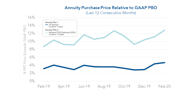 The spread of annuity purchase prices above the GAAP projected benefit obligation (PBO) remained fairly stable during 2019. This spread was around 3% for Annuity Plan 1 and 11% for Annuity Plan 2. In January 2020, the spread increased in part due to adoption of the new Pri-2012 mortality tables and MP-2019 mortality improvement scales, which generally lowered GAAP liabilities. In February 2020, the spread increased further as a result of the drop in annuity purchase interest rates and yield curve interest rates this month. Relative to GAAP, we have seen that an increase in annuity purchase rates generally lowers annuity purchase prices.