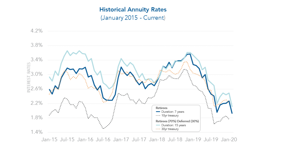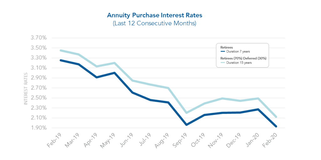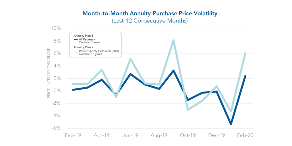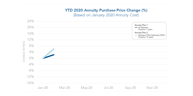 As mentioned in our January 2020 Pension Finance Update, pension plans lost ground last month. The strong equity market returns of 2019 were set back by a poor performance in January. The average duration 7 annuity purchase interest rates and average duration 15 rates have both decreased by roughly 35 basis points since last month. This decrease in rates led to a corresponding increase in annuity purchase prices of approximately 2% for Annuity Plan 1 and 6% for Annuity Plan 2. During our experience, insurers priced annuity purchases in 2019 aggressively and insurers are continuing to do so at the start of 2020.