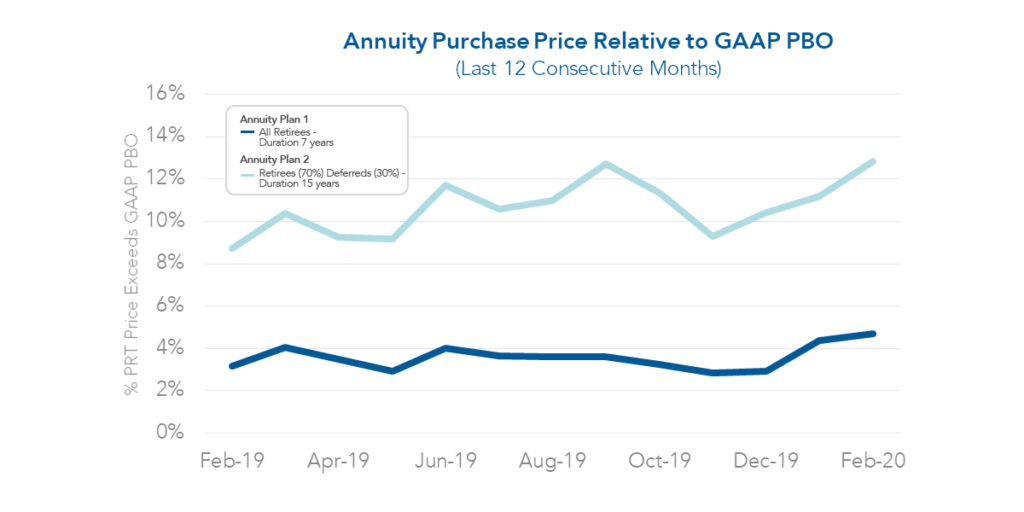 The spread of annuity purchase prices above the GAAP projected benefit obligation (PBO) remained fairly stable during 2019. This spread was around 3% for Annuity Plan 1 and 11% for Annuity Plan 2. In January 2020, the spread increased in part due to adoption of the new Pri-2012 mortality tables and MP-2019 mortality improvement scales, which generally lowered GAAP liabilities. In February 2020, the spread increased further as a result of the drop in annuity purchase interest rates and yield curve interest rates this month. Relative to GAAP, we have seen that an increase in annuity purchase rates generally lowers annuity purchase prices.