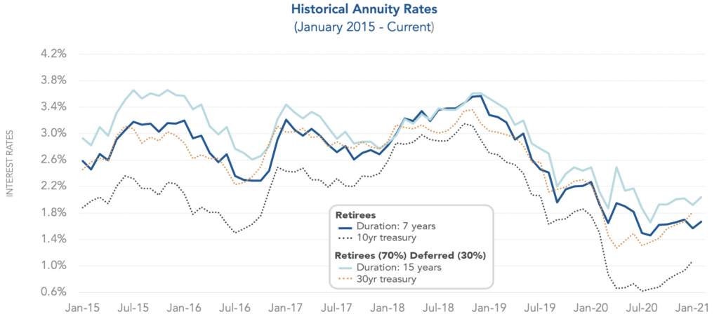 2021 marks a new year for plan sponsors. There are currently several happenings in the world that impact the marketplace. At the forefront are the persisting pandemic, rollout of vaccines, and new Biden-led administration. While we cannot predict how these major events will impact the marketplace, we can confidently state that the outlook for plan sponsors is trending positively. Equity markets are strong and interest rates are rising. This will generally lead to improved plan funding statuses and decreasing annuity purchase prices.