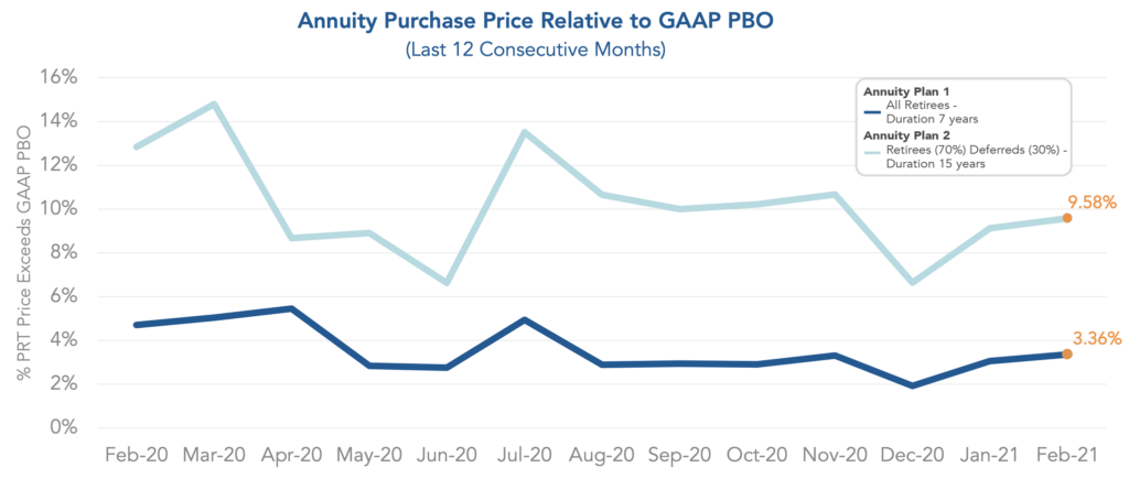 The spread of annuity purchase prices above the GAAP projected benefit obligation (PBO) is in line with historical averages. We refer to GAAP PBO and accounting book value interchangeably. In February 2021, the spread for Annuity Plan 1 is 3.36% and the spread for Annuity Plan 2 is 9.58% as seen in the below graph. An increase in annuity purchase rates generally lowers annuity purchase prices relative to accounting book value. Keep in mind that the below PBO calculations exclude future overhead costs paid by plan sponsors to retain participants in the plan. Administrative expenses and PBGC premiums are examples of these overhead costs. Future overhead costs would narrow the spread, though the extent is plan specific.