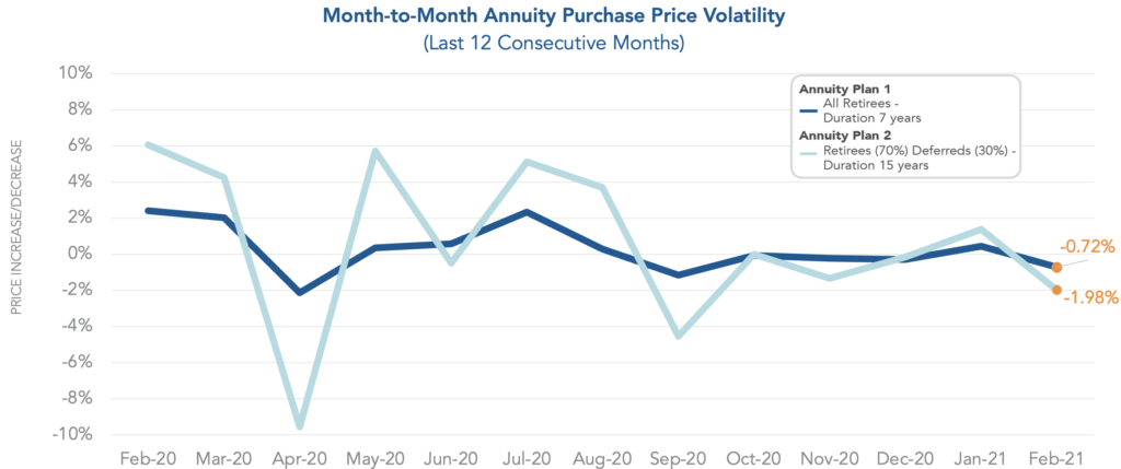 This past year significant month-to-month cost volatility has persisted. In the past month the annuity purchase price for Annuity Plan 1 decreased 0.72% and Annuity Plan 2 decreased 1.98% as seen in the below graph. Timing an early entrance to the insurance market is a crucial part of the planning stage because of the consistent short-term volatility of annuity pricing. Sponsors can take advantage of favorable fluctuations in a volatile market by connecting with an annuity search firm early.