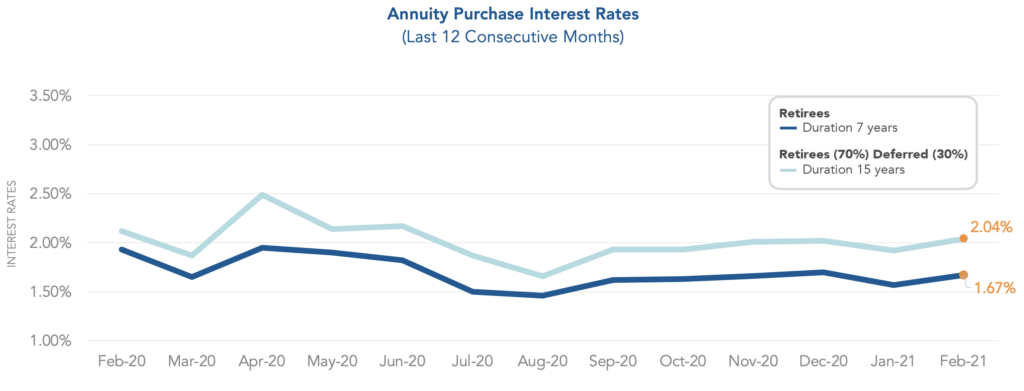 As mentioned in the January 2021 Pension Finance Update, pension plan funding statuses improved in January. The average duration 7 annuity purchase interest rates increased 10 basis points and average duration 15 rates increased 12 basis point since last month as seen in the below graph titled Annuity Purchase Interest Rates.