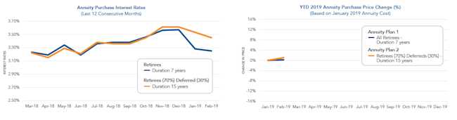 During 2018, the market experienced a favorable upward trend of rising interest rates which generally increased US defined benefit plan funding ratios. As interest rates climbed in 2018, plan liabilities dropped which led to a reduction in annuity purchase costs*. However, as interest rates began to drop in January and February 2019, annuity purchase costs began to increase along with plan liabilities.