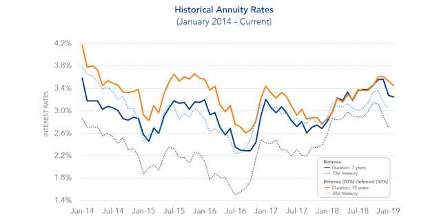 Annuity purchase interest rates can be volatile. Although 2018 experienced an upward trend in annuity purchase interest rates, history demonstrates these rates fluctuate over time with varying degrees of peaks and valleys. The evident drop in rates in January and February 2019 may be the start of a new valley or a temporary deviation from the upward trend experienced in 2018. Sponsors can reduce the impact of this volatility on their balance sheet through Pension Risk Transfer strategies.