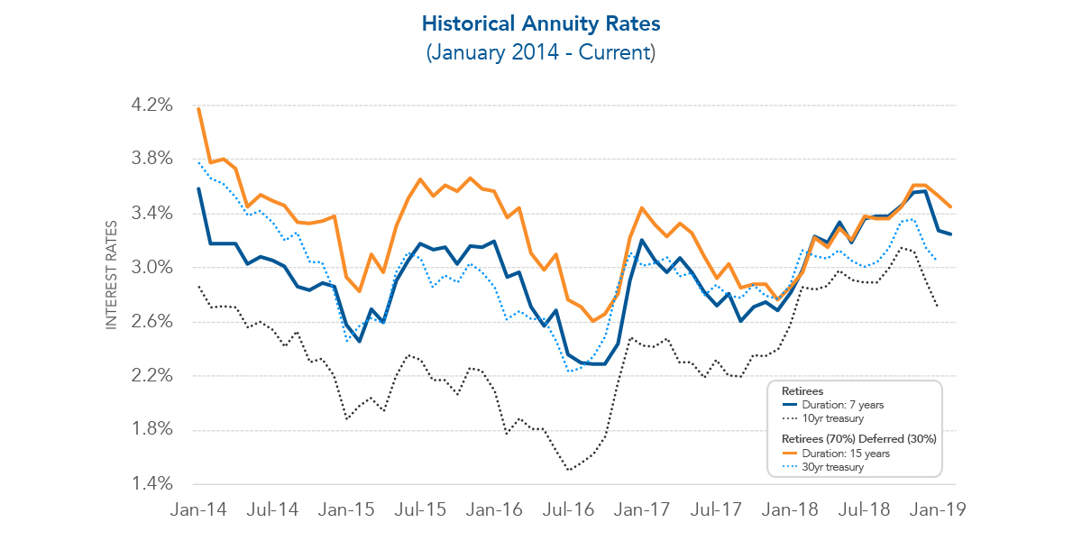 Annuity purchase interest rates can be volatile. Although 2018 experienced an upward trend in annuity purchase interest rates, history demonstrates these rates fluctuate over time with varying degrees of peaks and valleys. The evident drop in rates in January and February 2019 may be the start of a new valley or a temporary deviation from the upward trend experienced in 2018. Sponsors can reduce the impact of this volatility on their balance sheet through Pension Risk Transfer strategies.