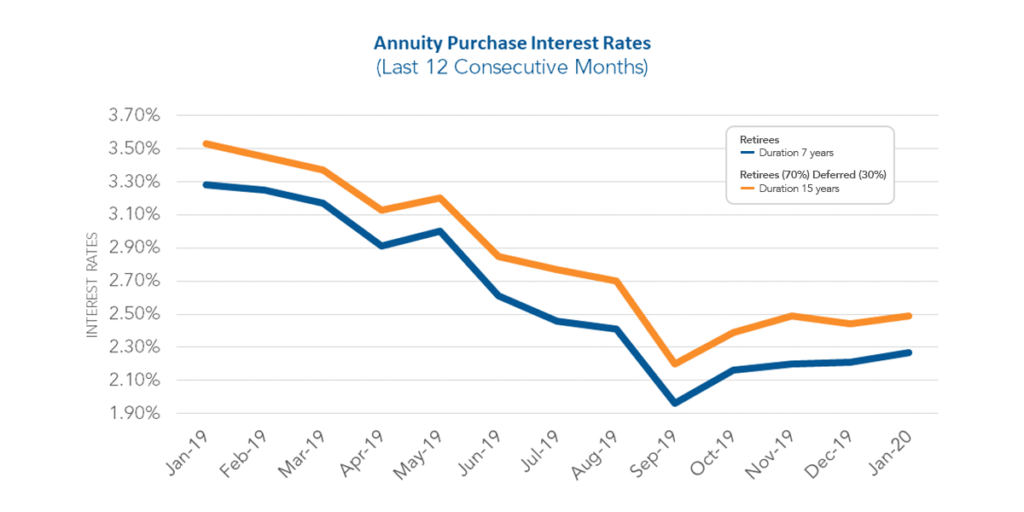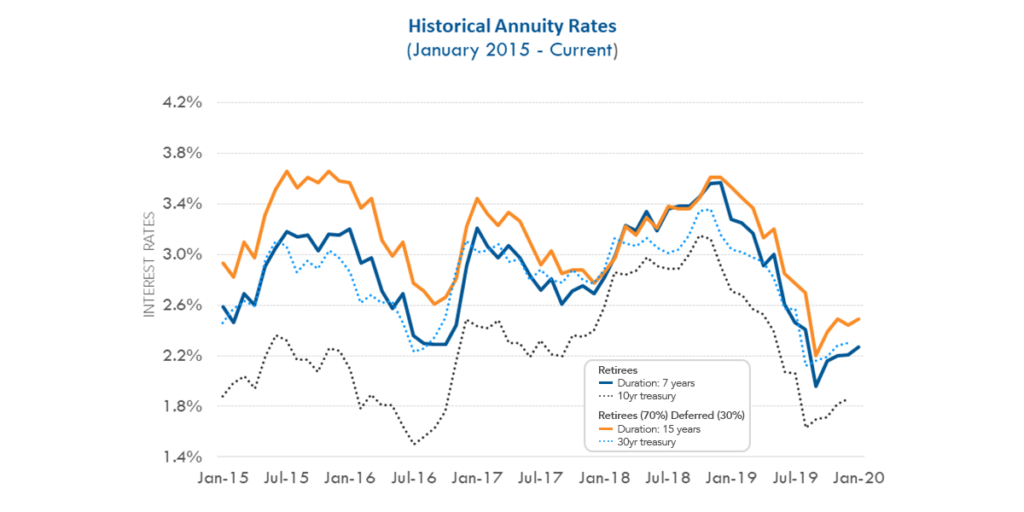 As mentioned in our December 2019 Pension Finance Update, pension plans continued to see an increase in funded status during this last quarter of 2019. Also, the equity market has experienced tremendous returns during 2019 and these returns have largely offset liability growth due to drops in interest rates. The average duration 7 annuity purchase interest rates and average duration 15 rates have both increased by roughly 30 basis points since September 2019.