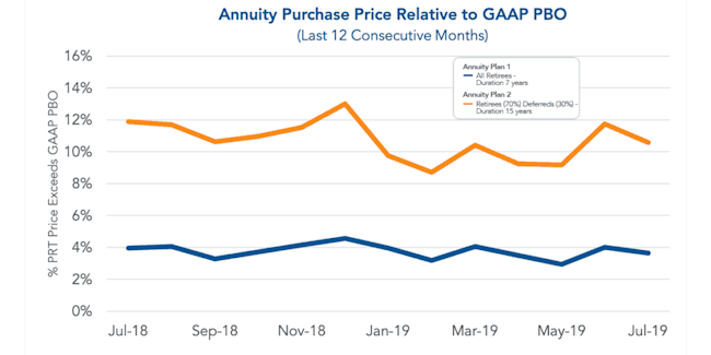 During 2018, the spread of annuity purchase prices above the GAAP projected benefit obligation (PBO) remained fairly stable, at around 4% for Annuity Plan 1 and 12% for Annuity Plan 2. From December 2018 to July 2019, as annuity purchase interest rates and yield curve interest rates changed rapidly, the spread fluctuated slightly up and down for both plans. Narrowing of the spread may represent an opportunity to complete an annuity purchase at a relatively cheaper price than when the spread is larger. Note that the below PBO calculations exclude future overhead costs that plan sponsors would pay to retain participants in the plan — examples of these overhead costs are administrative expenses and PBGC premiums. Future overhead costs would narrow the spread, though the extent to which the overhead costs narrow the spread is plan specific.