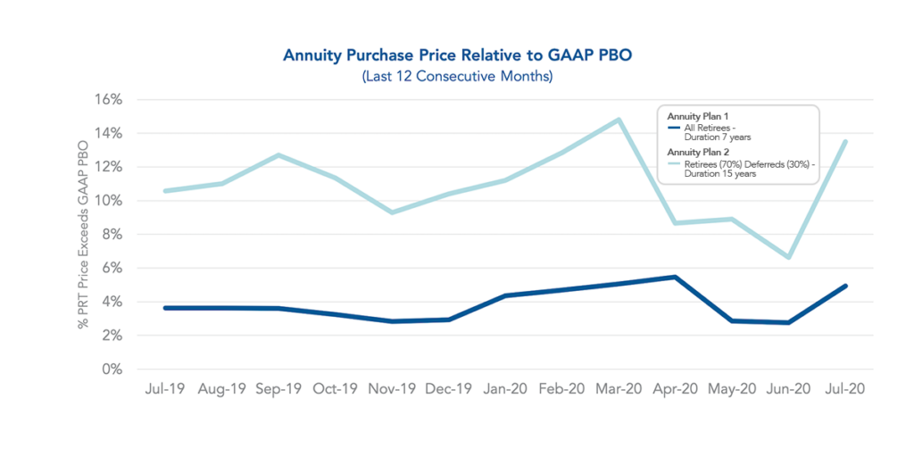 The spread of annuity purchase prices above the GAAP projected benefit obligation (PBO) remained fairly stable during 2019. This spread was around 3% for Annuity Plan 1 and 11% for Annuity Plan 2. In 2020, due to the COVID-19 pandemic, the spread has demonstrated more volatility. As of July 2020, the spread for Annuity Plan 1 has risen to 4.95% and the spread for Annuity Plan 2 has risen to 13.50%. Relative to GAAP, we have seen that an increase in annuity purchase rates generally lowers annuity purchase prices. Keep in mind that the below PBO calculations exclude future overhead costs paid by plan sponsors to retain participants in the plan. Administrative expenses and PBGC premiums are examples of these overhead costs. Future overhead costs would narrow the spread, though the extent is plan specific.