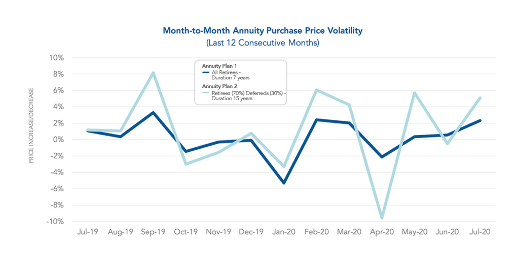 As mentioned in our June 2020 Pension Finance Update, pension plans gained ground last month. The strong equity market returns of 2019 were set back by poor performance in the first quarter of 2020, but Q2 2020 gains reversed the downward 2020 trend. The average duration 7 annuity purchase interest rates decreased by 32 basis points and average duration 15 rates decreased by 30 basis points since last month. This change in rates led to a corresponding increase in annuity purchase price of 5.64% for Annuity Plan 1 and a 10.48% increase for Annuity Plan 2.