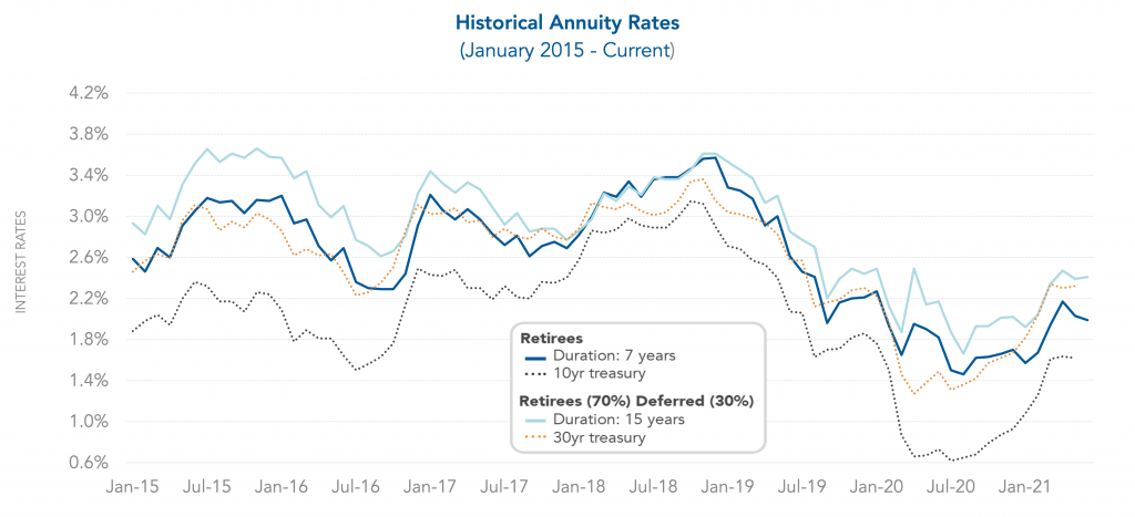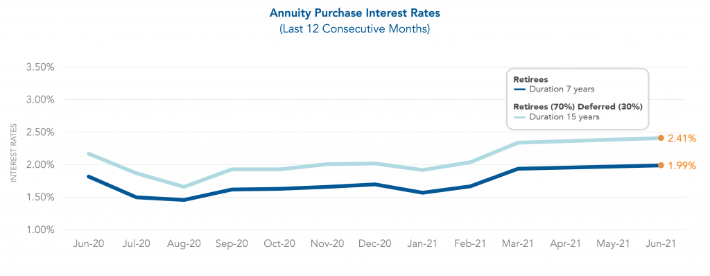 As mentioned in the May 2021 Pension Finance Update, pension plan funding statuses stayed level in May. The average duration 7 annuity purchase interest rates decreased 4 basis points and average duration 15 rates increased 2 basis point since last month as seen in the below graph titled Annuity Purchase Interest Rates.