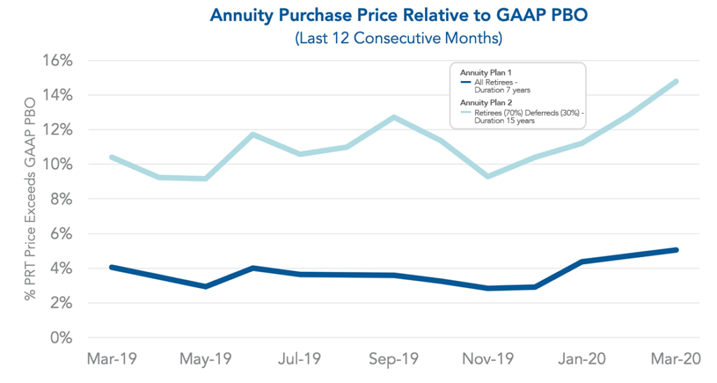 The spread of annuity purchase prices above the GAAP projected benefit obligation (PBO) remained fairly stable during 2019. This spread was around 3% for Annuity Plan 1 and 11% for Annuity Plan 2. In January 2020, the spread increased in part due to adoption of the new Pri-2012 mortality tables and MP-2019 mortality improvement scales, which generally lowered GAAP liabilities. In February and March 2020, the spread increased further as a result of the significant drop in annuity purchase interest rates and yield curve interest rates.