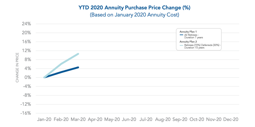 As mentioned in our February 2020 Pension Finance Update, pension plans lost ground last month. The strong equity market returns of 2019 were set back by poor performance in both January and February. The average duration 7 annuity purchase interest rates and average duration 15 rates have both decreased by roughly 27 basis points since last month. This decrease in rates led to a corresponding increase in annuity purchase prices of approximately 2% for Annuity Plan 1 and 4.25% for Annuity Plan 2.