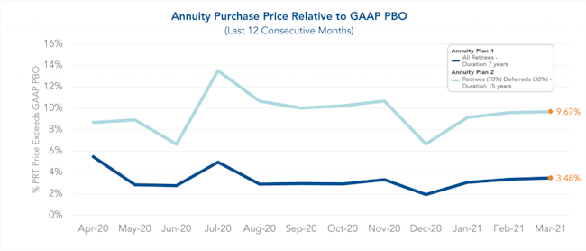 The spread of annuity purchase prices above the GAAP projected benefit obligation (PBO) is in line with historical averages. We refer to GAAP PBO and accounting book value interchangeably. In March 2021, the spread for Annuity Plan 1 is 3.48% and the spread for Annuity Plan 2 is 9.67% as seen in the below graph. An increase in annuity purchase rates generally lowers annuity purchase prices relative to accounting book value. Keep in mind that the below PBO calculations exclude future overhead costs paid by plan sponsors to retain participants in the plan. Administrative expenses and PBGC premiums are examples of these overhead costs. Future overhead costs would narrow the spread, though the extent is plan specific.