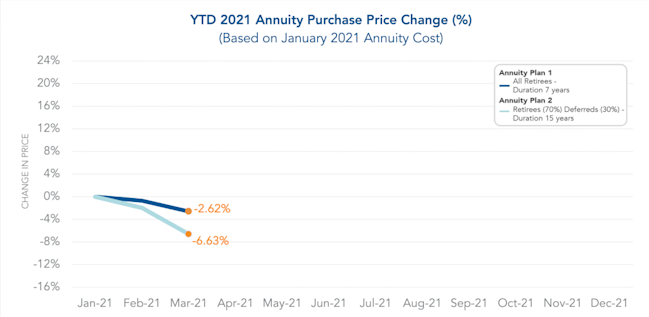Most pension plans with a liability duration of around 10 would see about a 3% decrease in annuity cost this past month