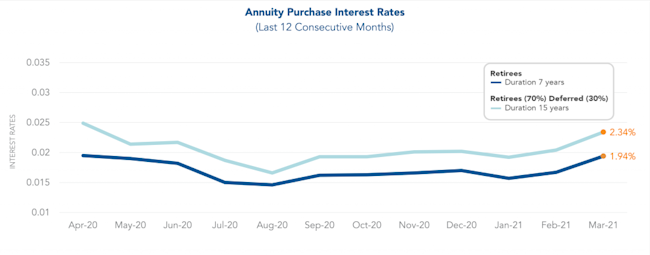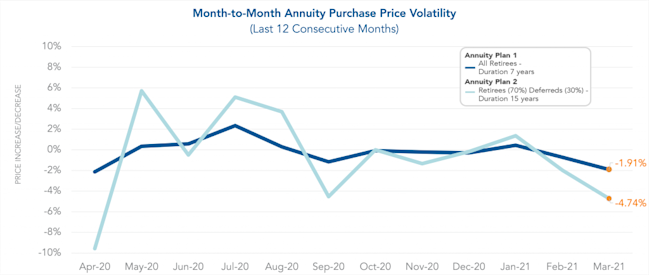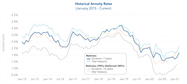 As mentioned in the February 2021 Pension Finance Update, pension plan funding statuses improved in February. The average duration 7 annuity purchase interest rates increased 27 basis points and average duration 15 rates increased 30 basis point since last month as seen in the below graph titled Annuity Purchase Interest Rates.