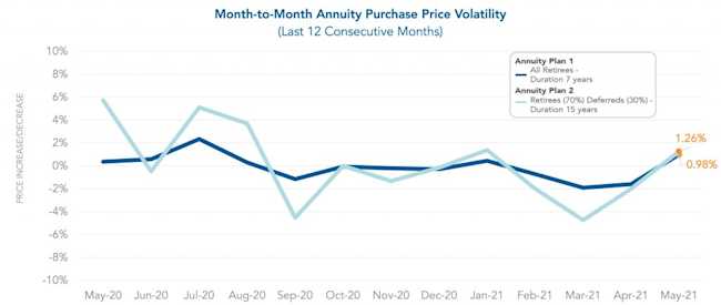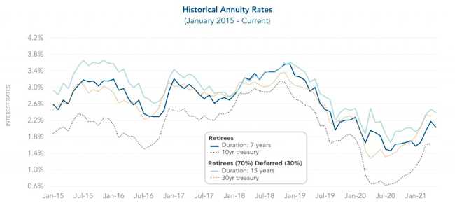 As mentioned in the April 2021 Pension Finance Update, pension plan funding statuses improved in March. The average duration 7 annuity purchase interest rates decreased 14 basis points and average duration 15 rates decreased 8 basis point since last month (as seen in the below graph titled Annuity Purchase Interest Rates).