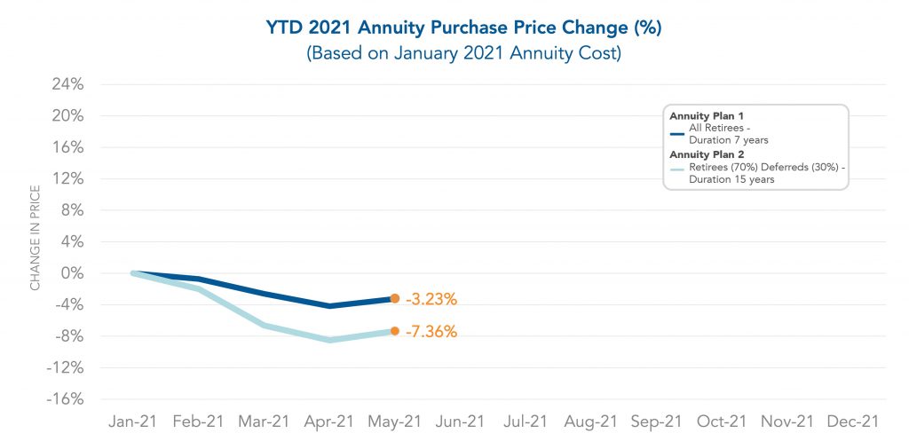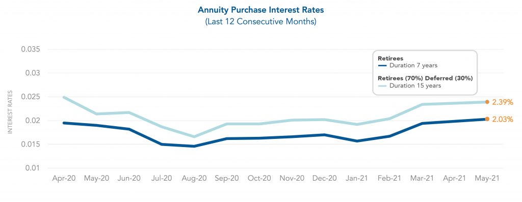As mentioned in the April 2021 Pension Finance Update, pension plan funding statuses improved in March. The average duration 7 annuity purchase interest rates decreased 14 basis points and average duration 15 rates decreased 8 basis point since last month (as seen in the below graph titled Annuity Purchase Interest Rates).