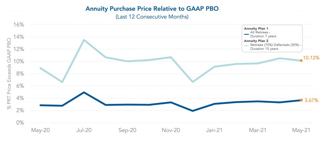The spread of annuity purchase prices above the GAAP projected benefit obligation (PBO) is in line with historical averages. (We refer to GAAP PBO and accounting book value interchangeably.) In May 2021, the spread for Annuity Plan 1 is 3.67% and the spread for Annuity Plan 2 is 10.12% as seen in the below graph. An increase in annuity purchase rates generally lowers annuity purchase prices relative to accounting book value. Keep in mind that the below PBO calculations exclude future overhead costs paid by plan sponsors to retain participants in the plan. Administrative expenses and PBGC premiums are examples of these overhead costs. Future overhead costs would narrow the spread, though the extent is plan specific.