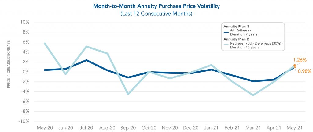 This past year, significant month-to-month cost volatility has persisted. In the past month the annuity purchase price for Annuity Plan 1 increased 0.98% and Annuity Plan 2 decreased 1.26% as seen in the below graph. Timing an early entrance to the insurance market is a crucial part of the planning stage because of the consistent short-term volatility of annuity pricing. Sponsors can take advantage of favorable fluctuations in a volatile market by connecting with an annuity search firm early.