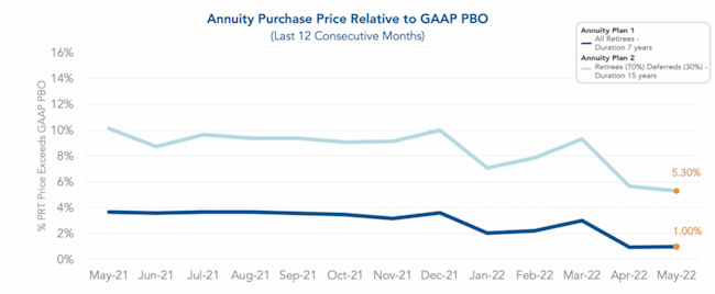 The graph below represents the spread between annuity purchase price above GAAP pojected benefit obligation (PBO). We refer to GAAP PBO and accounting book value interchangeably. In May 2022, the spread for Annuity Plan 1 slightly increased to 1.00%. Although it widened, the spread is still substantially lower than the historical averages. For Annuity Plan 2, the spread narrowed to 5.30%. This is the lowest we have witnessed in the last 12 months. An increase in annuity purchase rates generally lowers annuity purchase prices relative to accounting book value. Please note, that the below PBO calculations exclude future overhead costs paid by plan sponsors to retain participants in the plan. Administrative expenses and PBGC premiums are examples of these overhead costs. Future overhead costs would narrow the spread, though the extent is plan specific.