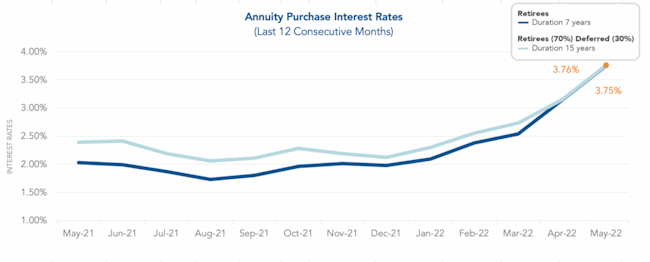 • The average Annuity Purchase Interest rates are the highest we have observed, with the average duration 7 rate at 3.75% and average duration 15 rate at 3.76%.