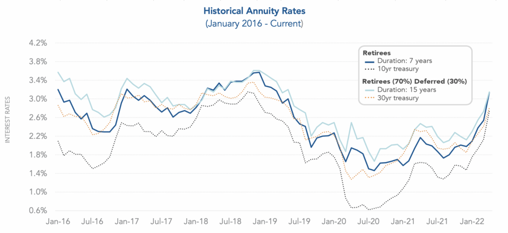 • The average Annuity Purchase Interest rates are the highest we have observed, with the average duration 7 rate at 3.75% and average duration 15 rate at 3.76%.
