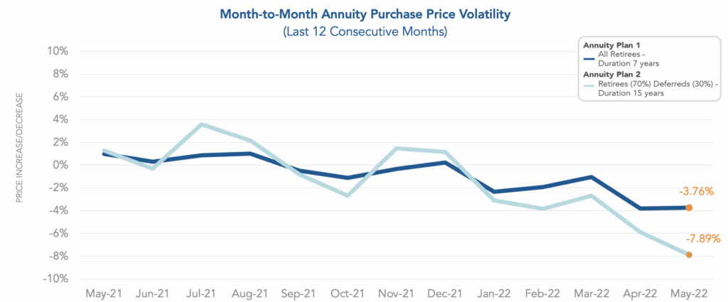 As seen below, annuity purchase price varies from month to month. In 2022, we have observed a downward trend in cost. The purchase price for Annuity Plan 1 decreased 3.76% and Annuity Plan 2 dropped 7.89%. Timing an early entrance to the insurance market is a crucial part of the planning stage because of the consistent short-term volatility of annuity pricing. Sponsors can take advantage of favorable fluctuations in a volatile market by connecting with an annuity search firm early.