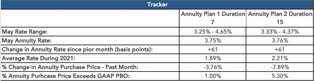 The graph below represents the spread between annuity purchase price above GAAP pojected benefit obligation (PBO). We refer to GAAP PBO and accounting book value interchangeably. In May 2022, the spread for Annuity Plan 1 slightly increased to 1.00%. Although it widened, the spread is still substantially lower than the historical averages. For Annuity Plan 2, the spread narrowed to 5.30%. This is the lowest we have witnessed in the last 12 months. An increase in annuity purchase rates generally lowers annuity purchase prices relative to accounting book value. Please note, that the below PBO calculations exclude future overhead costs paid by plan sponsors to retain participants in the plan. Administrative expenses and PBGC premiums are examples of these overhead costs. Future overhead costs would narrow the spread, though the extent is plan specific.