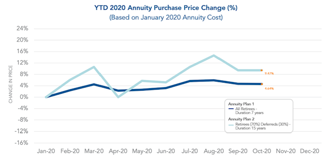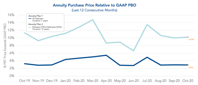 The spread of annuity purchase prices above the GAAP projected benefit obligation (PBO) remained fairly stable during 2019. This spread was around 3% for Annuity Plan 1 and 11% for Annuity Plan 2. In 2020, the spread has demonstrated more volatility due to the COVID-19 pandemic. As of October 2020, the spread for Annuity Plan 1 is 2.92% and the spread for Annuity Plan 2 is 10.22% as seen in the below graph. Relative to GAAP, an increase in annuity purchase rates generally lowers annuity purchase prices.