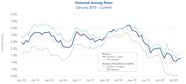 Pension plans have experienced unprecedented volatility in 2020. While the market volatility has caused the treasury rates to drop dramatically, the spread between treasury bonds and the bonds insurance companies invest in have widened. The widening of this spread typically tells us that now would be a good time for pension plans to purchase annuities. Furthermore, we’ve observed aggressive pricing from the insurance companies in 2020. We have conducted multiple annuity purchases in 2020 where the retiree premium matched GAAP liabilities.