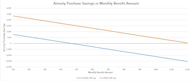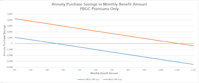 Annuity purchases for retirees with small benefit amounts can be an easy and highly effective way to reduce PBGC premiums and save money at no cost to plan participants. For plan sponsors not subject to the PBGC Variable Rate Premium Cap, purchasing annuities for retirees receiving less than $350 monthly will save the plan money. For plan sponsors subject to the cap, purchasing annuities for retirees receiving less than $1,100 monthly will save the plan money.