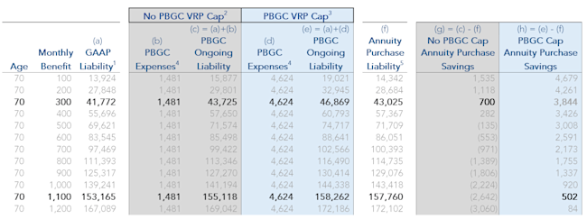 We also conducted our analysis on two hypothetical plans, one which is subject to the PBGC Variable-Rate Premium Cap, and one which is not. The break-even points for both hypothetical plans are shown in bold below. You will see that the break-even point for plans not subject to the PBGC VRP Cap is approximately $350 and for plans subject to the cap the break-even point is approximately $1,100. If a given plan is paying PBGC variable-rate premiums but is not subject to the VRP Cap, the break-even point for the plan would likely fall between the $350 and $1,100 levels of our two hypothetical plans.