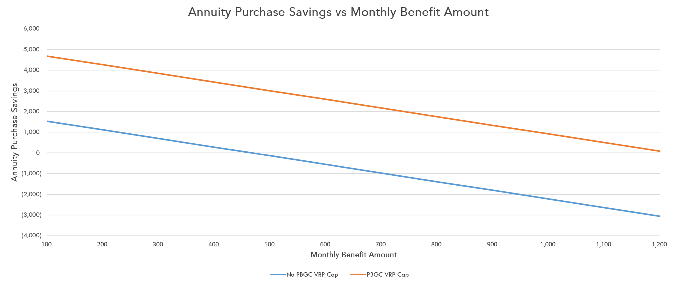 Annuity purchases for retirees with small benefit amounts can be an easy and highly effective way to reduce PBGC premiums and save money at no cost to plan participants. For plan sponsors not subject to the PBGC Variable Rate Premium Cap, purchasing annuities for retirees receiving less than $350 monthly will save the plan money. For plan sponsors subject to the cap, purchasing annuities for retirees receiving less than $1,100 monthly will save the plan money.