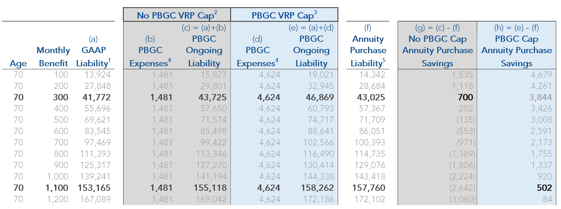 We also conducted our analysis on two hypothetical plans, one which is subject to the PBGC Variable-Rate Premium Cap, and one which is not. The break-even points for both hypothetical plans are shown in bold below. You will see that the break-even point for plans not subject to the PBGC VRP Cap is approximately $350 and for plans subject to the cap the break-even point is approximately $1,100. If a given plan is paying PBGC variable-rate premiums but is not subject to the VRP Cap, the break-even point for the plan would likely fall between the $350 and $1,100 levels of our two hypothetical plans.