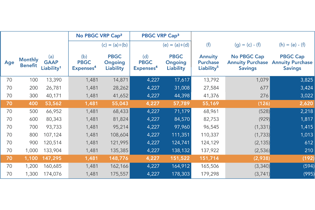 Annuity purchases for retirees with small benefit amounts can be an easy and highly effective way to reduce PBGC premiums and save money at no cost to plan participants. For plan sponsors not subject to the PBGC Variable Rate Premium Cap, purchasing annuities for retirees receiving less than $350 monthly will save the plan money. For plan sponsors subject to the cap, purchasing annuities for retirees receiving less than $1,050 monthly will save the plan money.