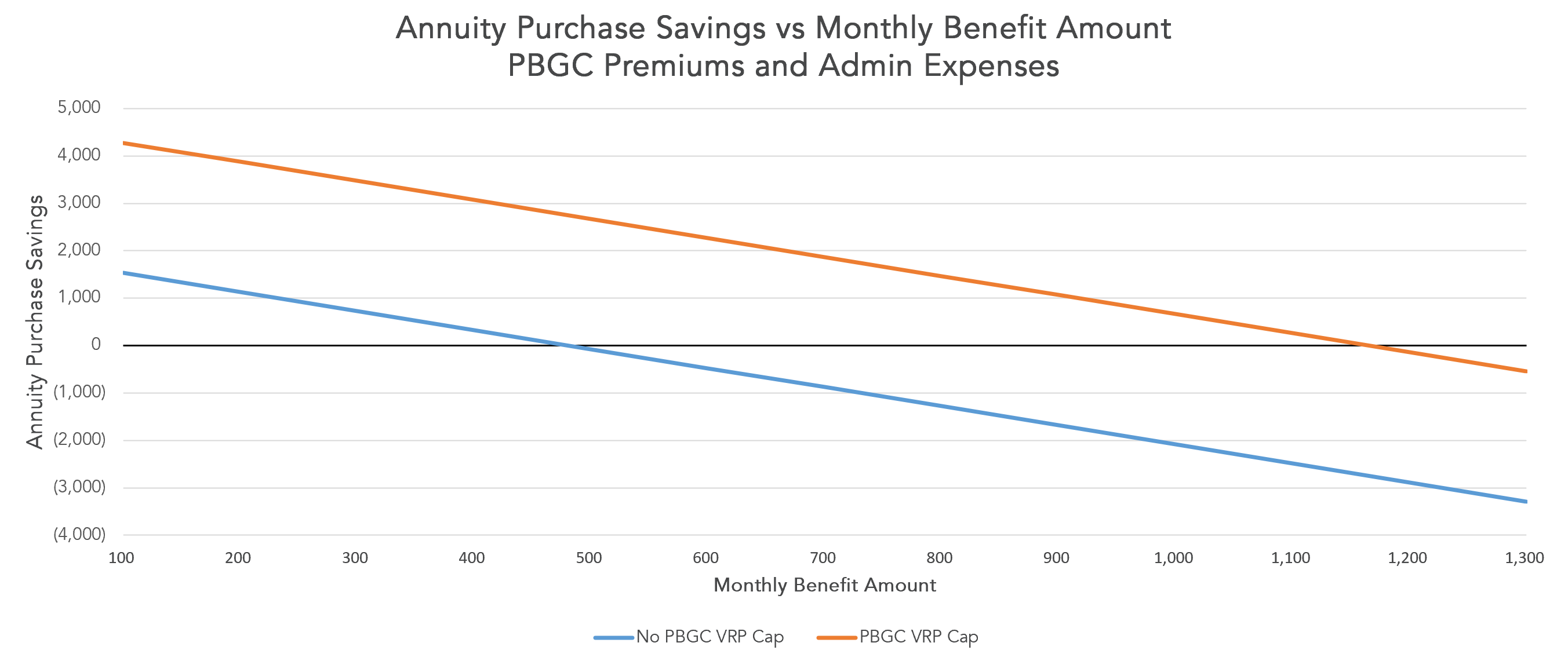 With this concept in mind, we set out to identify a "break-even" point. In other words, if you as a plan sponsor were going to purchase annuities for a subset of your retiree population, where should you draw the line in order for the transaction to make financial sense? For retirees with benefits below the break-even point, the annuity purchase will cost less than retaining them in the plan and continuing to pay PBGC premiums. For retirees with benefit amounts above the break-even point, the annuity purchase may be more expensive than retaining the participants in the plan. Below are the results of our analysis on a hypothetical age 70 retiree with varying monthly benefit amounts. Our results were very similar for retirees at different ages.