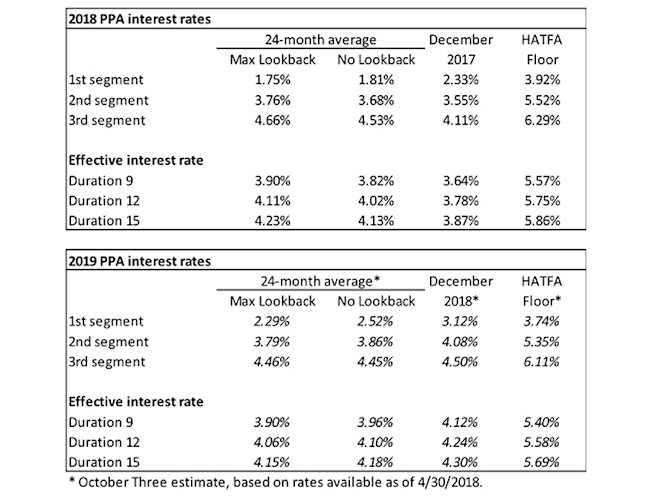 The table below summarizes rates that plan sponsors are required to use for IRS funding purposes for 2018, along with estimates for 2019. Pre-relief, both 24-month averages and December ‘spot’ rates, which are still required for some calculations, such as PBGC premiums, are also included.