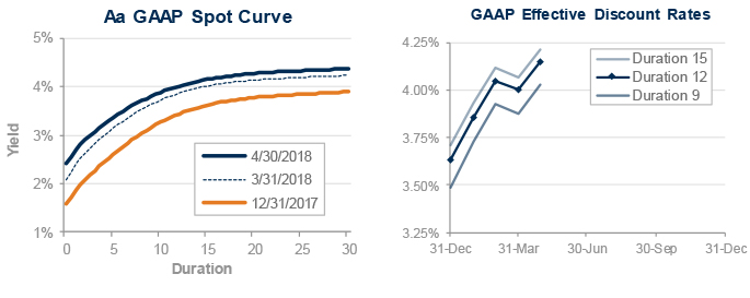 Pension liabilities (for funding, accounting, and de-risking purposes) are now driven by market interest rates. The graph on the left compares our Aa GAAP spot yield curve at December 31, 2017, and April 30, 2018, and it also shows the movement in the curve last month. The graph on the right shows our estimate of movements in effective GAAP discount rates for pension obligations of various duration during 2018: