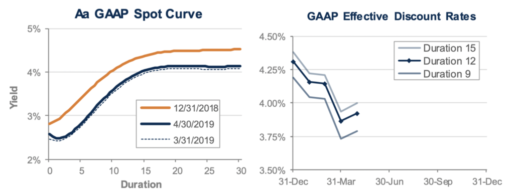 Pension liabilities (for funding, accounting, and de-risking purposes) are driven by market interest rates. The graph on the left compares our Aa GAAP spot yield curve at December 31, 2018, and April 30, 2019, and it also shows the movement in the curve last month. The graph on the right shows our estimate of movements in effective GAAP discount rates for pension obligations of various duration during 2019: