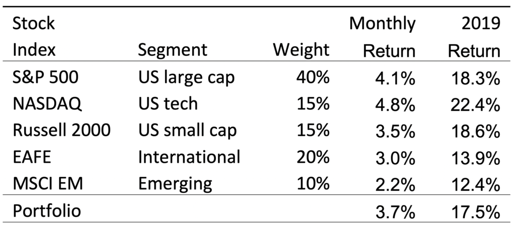 Stocks gained ground in April and are up impressively so far in 2019. The table below summarizes returns on various stock indexes included in our model portfolio