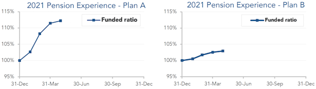 Pension finances held steady in April, as higher stock markets offset lower interest rates. Both model plans we track[1] improved less than 1% last month. Through the first four months of 2021, Plan A is now up 12%, while the more conservative Plan B has improved 3% this year: