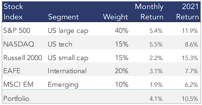 Stocks built on a solid first quarter with their best month of the year in April. A diversified stock portfolio gained 4% in April and is now up more than 10% for the year: