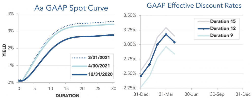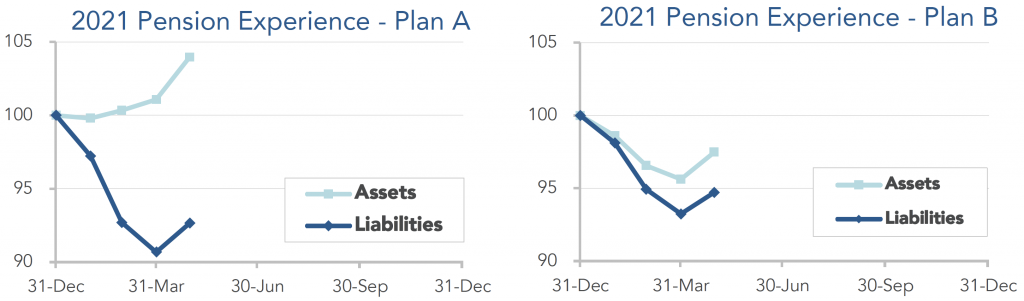 Pension finances held steady in April, as higher stock markets offset lower interest rates. Both model plans we track[1] improved less than 1% last month. Through the first four months of 2021, Plan A is now up 12%, while the more conservative Plan B has improved 3% this year: