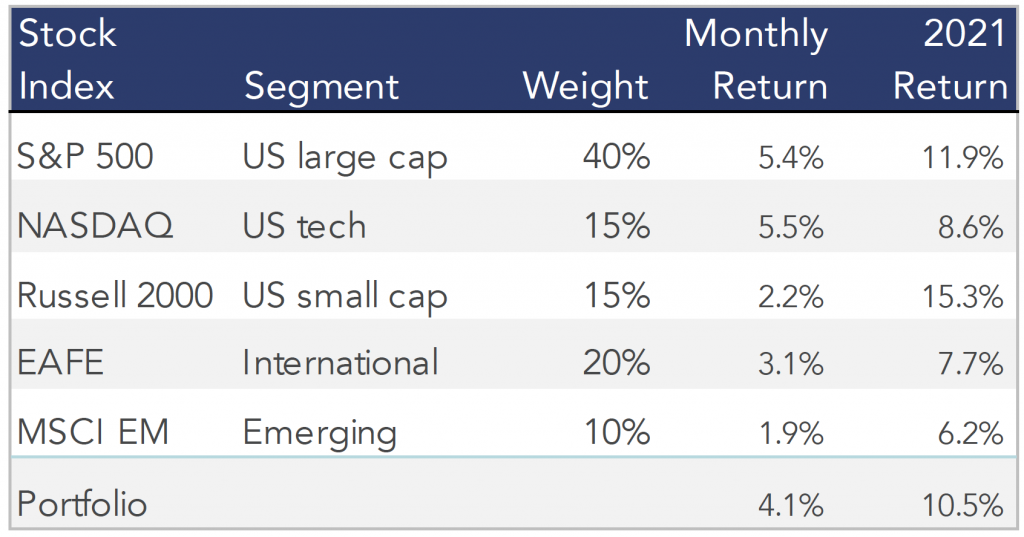 Stocks built on a solid first quarter with their best month of the year in April. A diversified stock portfolio gained 4% in April and is now up more than 10% for the year: