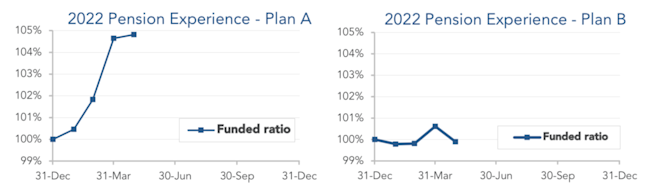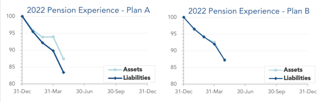 Despite a double-digit drop in stocks so far this year, pension sponsors have managed to tread water or better due to sharply higher interest rates. The graphs below show the movement of assets and liabilities during the first four months of 2022: