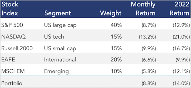 Overall, our traditional 60/40 portfolio lost 7% last month and is now down 13% for the year, while the conservative 20/80 portfolio lost 6% in April and is now also down 13% through the first four months of 2022.